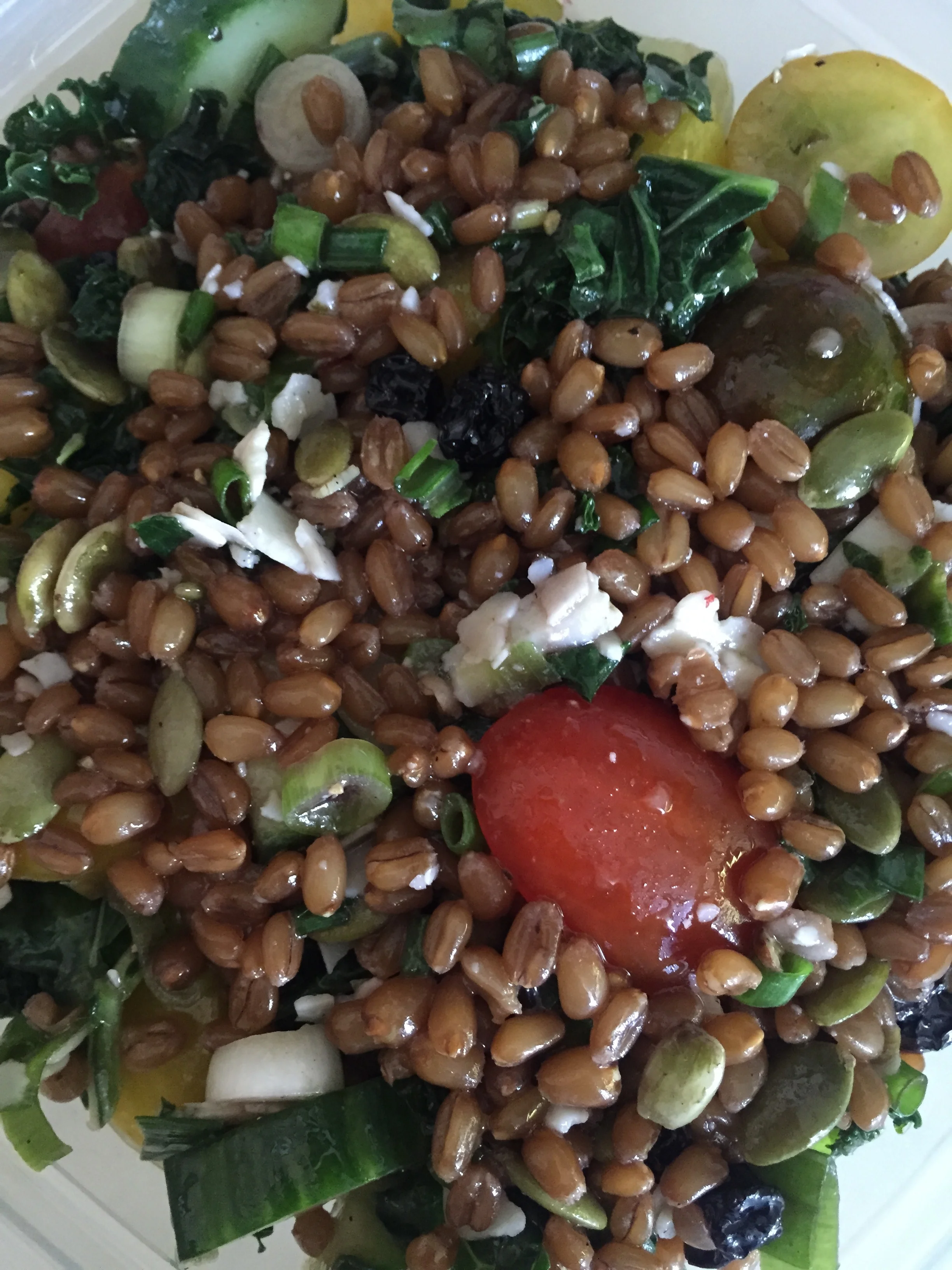 - Chop all salad ingredients and add to a large mixing bowl. Add the cooled wheat berries to the other salad ingredients and mix well.