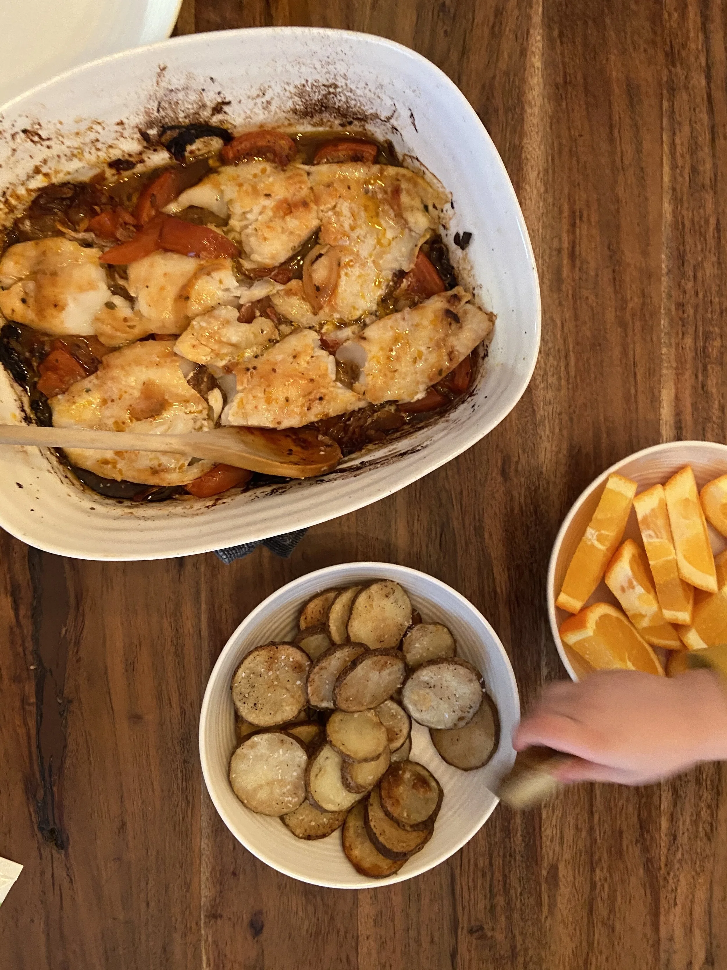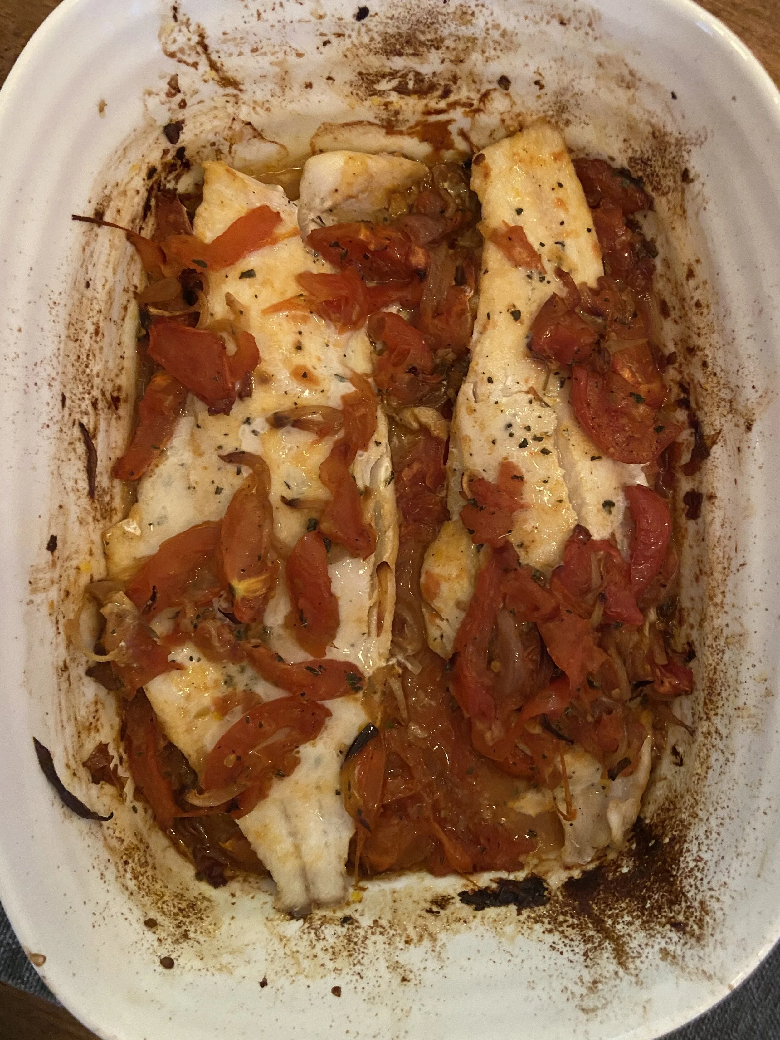 Since becoming a mom of now two little boys, I’m finding that I need faster, simple, kid-friendly, flavourful meals that I can get on the table in a hurry. I developed this recipe because it can be prepped ahead of time (even the night before or whenever you have some spare time in your day) which is a huge time saver when it comes to dinner time. The prep work and the roasting of the tomato and onion mixture can be done well before dinner so all you have to do is cook the fish. Fish is an easy protein for young children to eat because the flesh is so tender and whitefish is really mild, so its a great variety to add into your rotation. All that’s left for you to do is cook a side dish and we really like potatoes, rice, or pasta to pair with this meal.