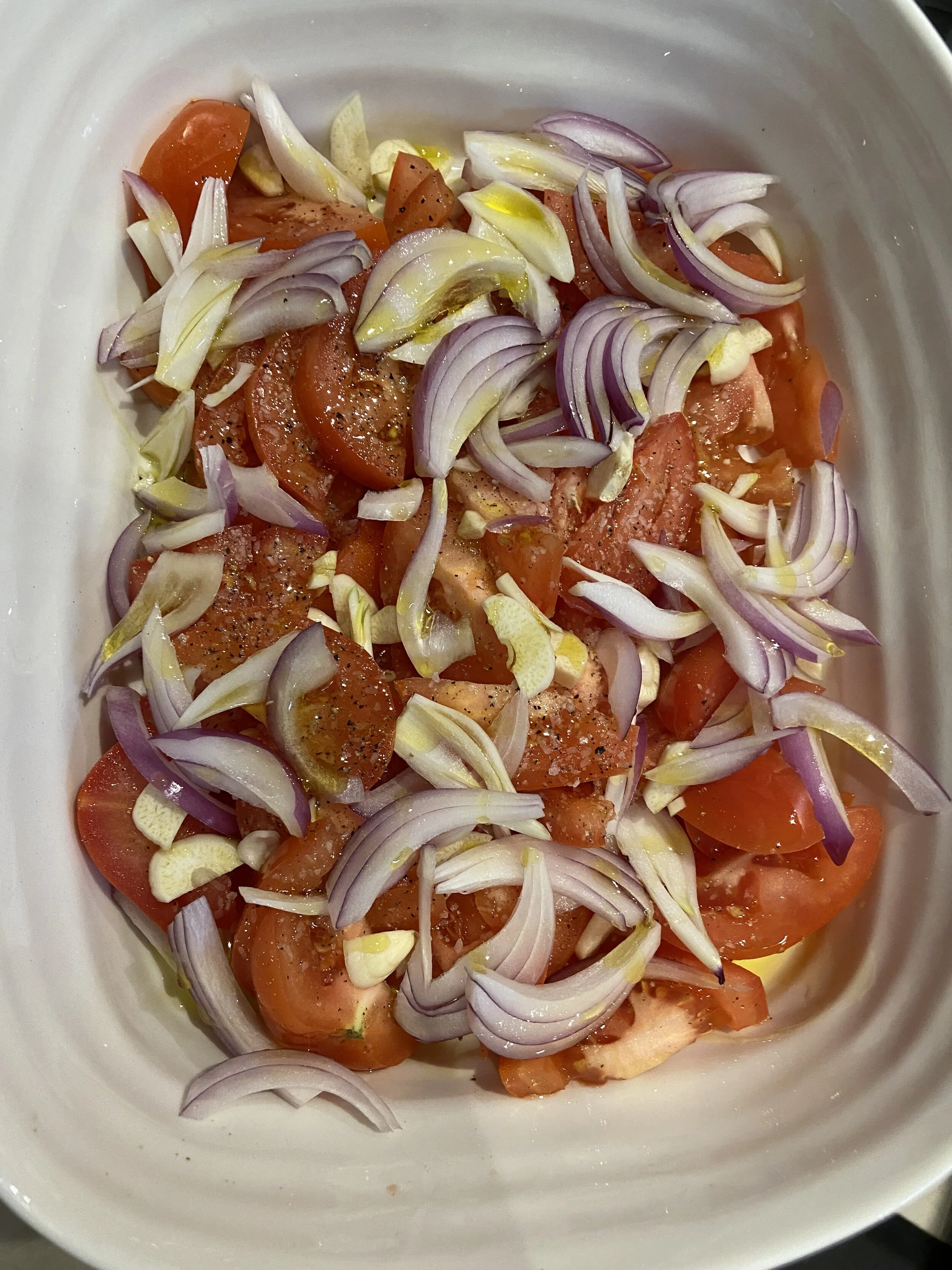 Layer tomatoes, onion, and garlic in a baking dish. Add oregano, salt, pepper, and drizzle with olive oil. Mix everything to combine and then bake in oven for 30-40 minutes. Tomatoes will blister and soften.